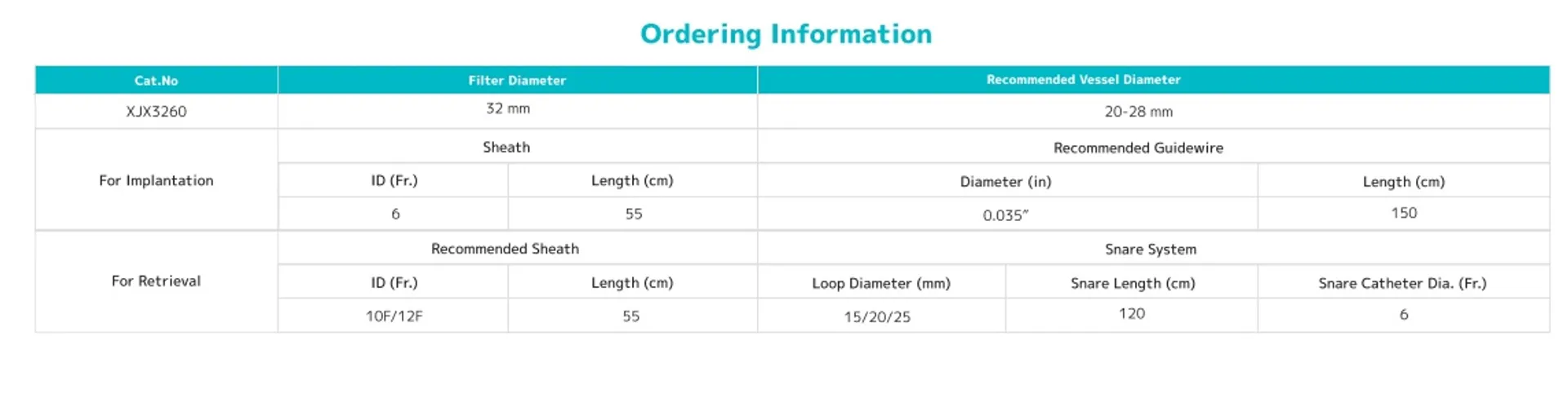 Кава-фильтр Aegisy ™ Vena Cava поставляется с комплектом интродьюсера, который включает систему доставки 6F, дилататор, доставляющий кабель 4,5F и загрузчик 6F.