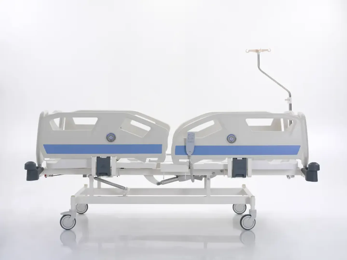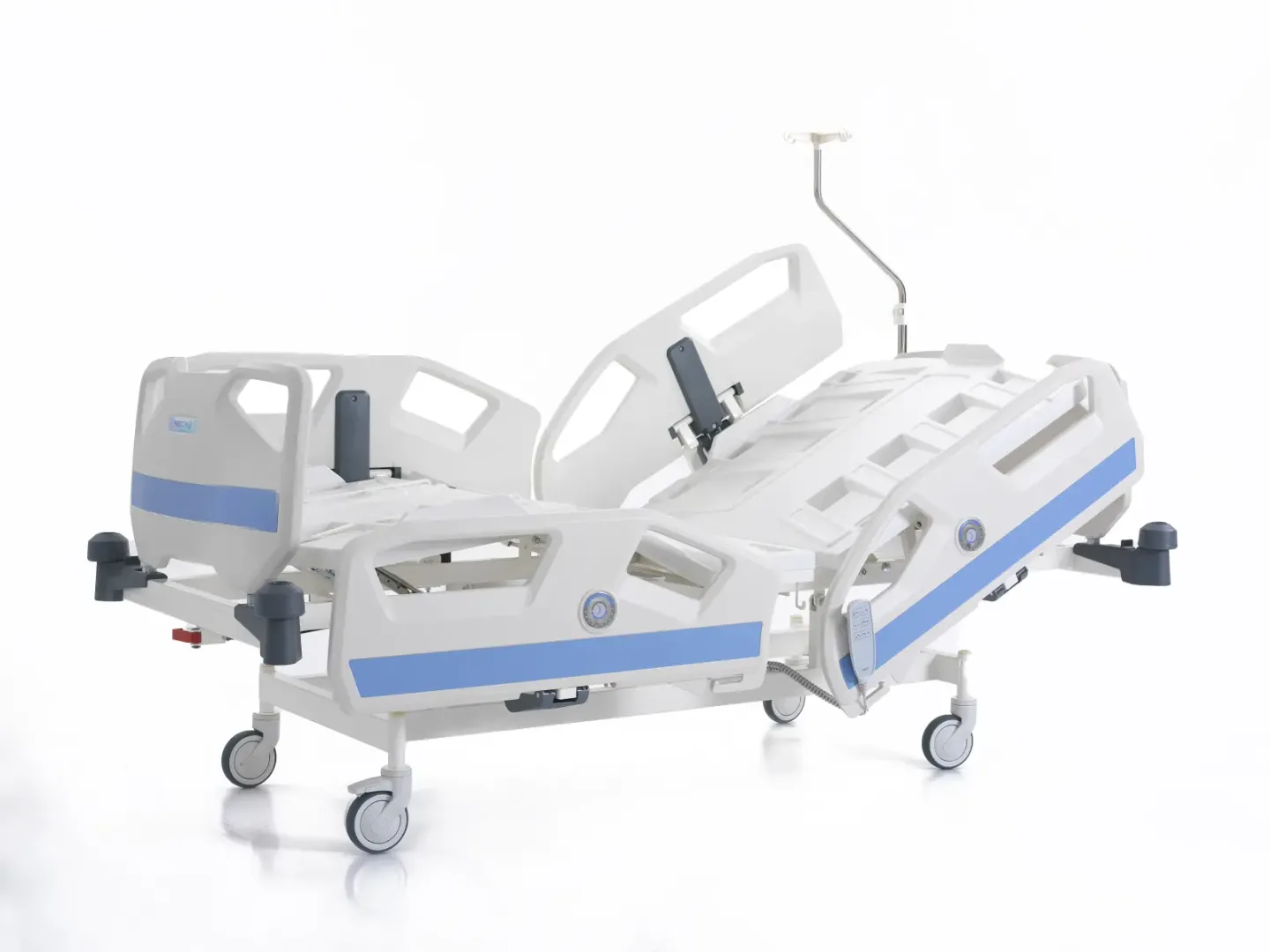 Кровать оснащена антибактериальным покрытием, колесами с блокировкой для стабильности и аварийной системой понижения в случае отключения питания.